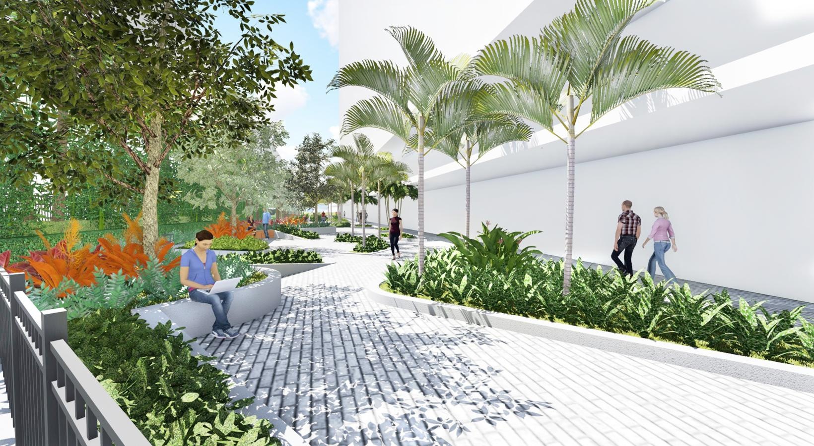 • a group of people walking on a walkway with palm trees and a fence